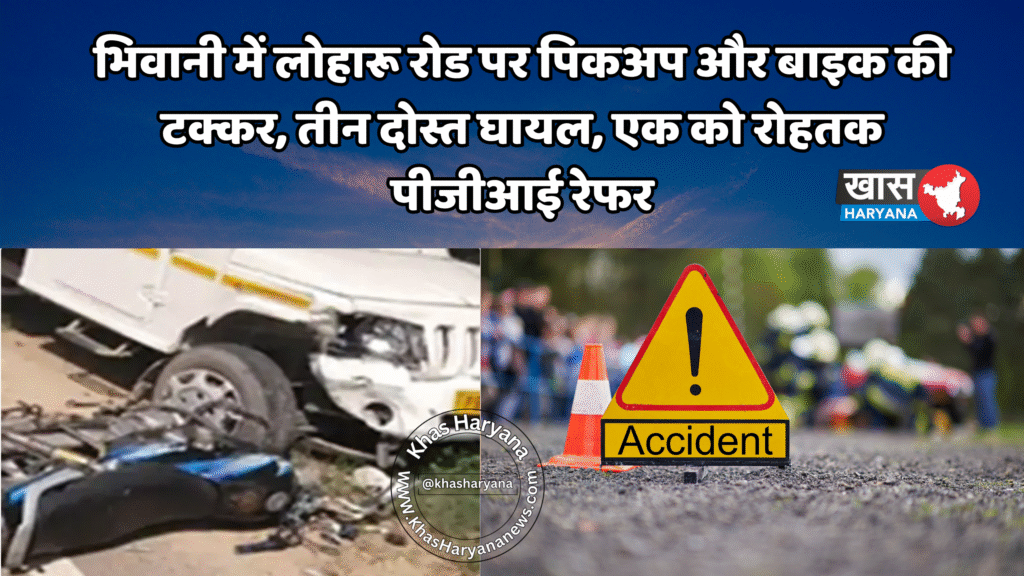भिवानी के लोहारू रोड पर जुई के पास पिकअप और बाइक की टक्कर में तीन दोस्त घायल हो गए। एक युवक की गंभीर हालत को देखते हुए रोहतक पीजीआई रेफर किया गया। पुलिस ने मामला दर्ज कर जांच शुरू कर दी है।