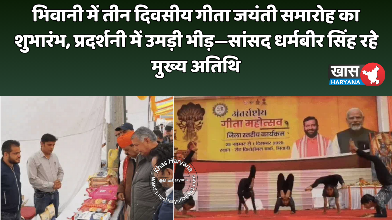 भिवानी के किरोड़ीमल पार्क में शनिवार को तीन दिवसीय गीता जयंती समारोह का शुभारंभ धूमधाम से किया गया। उद्घाटन अवसर पर भिवानी-हनुमानगढ़ लोकसभा क्षेत्र के सांसद चौधरी धर्मबीर सिंह मुख्य अतिथि के रूप में पहुंचे। आयोजन स्थल पर लगाई गई प्रदर्शनी देखने के लिए सुबह से ही स्कूली बच्चों, महिलाओं और आमजन की भीड़ उमड़ पड़ी।