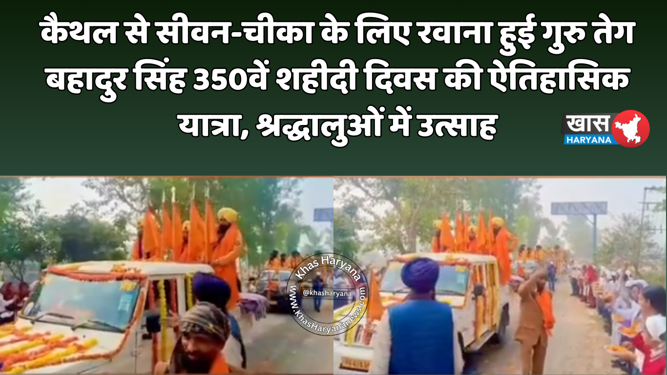 हरियाणा सरकार द्वारा गुरु तेग बहादुर सिंह जी के 350वें शहीदी दिवस के उपलक्ष्य में निकाली जा रही ऐतिहासिक यात्रा शनिवार को कैथल से सीवन और चीका के लिए रवाना हो गई। इस दौरान पूरे वातावरण में “बोले सो निहाल… सत श्री अकाल” के जयकारे गूंज उठे। यात्रा में बड़ी संख्या में संगत शामिल हुई, जिसने पूरे मार्ग को भक्तिमय बना दिया।