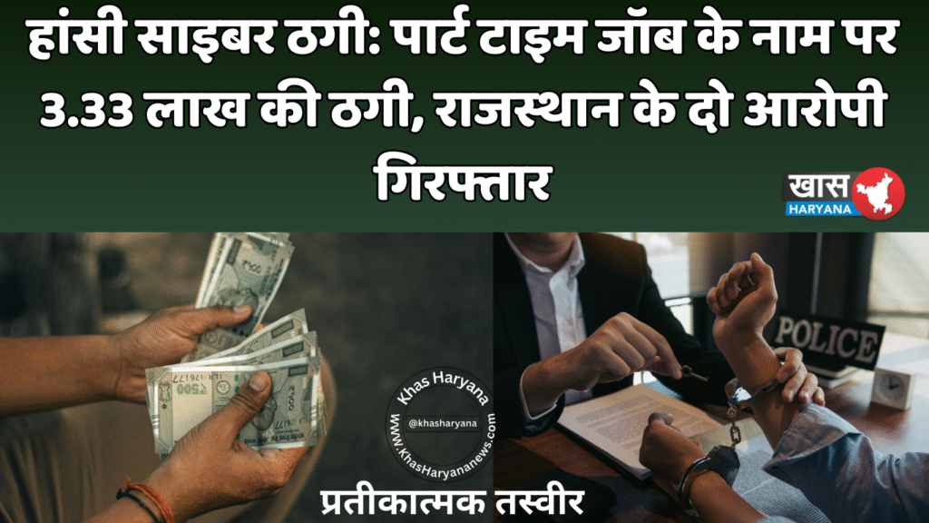 हांसी पुलिस ने साइबर ठगी के एक बड़े मामले में दो और आरोपियों को गिरफ्तार कर बड़ी सफलता हासिल की है। यह गिरोह पार्ट टाइम जॉब और ऑनलाइन टास्क पूरा कराने के नाम पर लोगों से लाखों रुपए ठग रहा था। गिरफ्तार किए गए आरोपियों की पहचान शाकिर हुसैन और विशाल के रूप में हुई है, जो राजस्थान के जोधपुर जिले के ज्योति नगर के रहने वाले हैं।