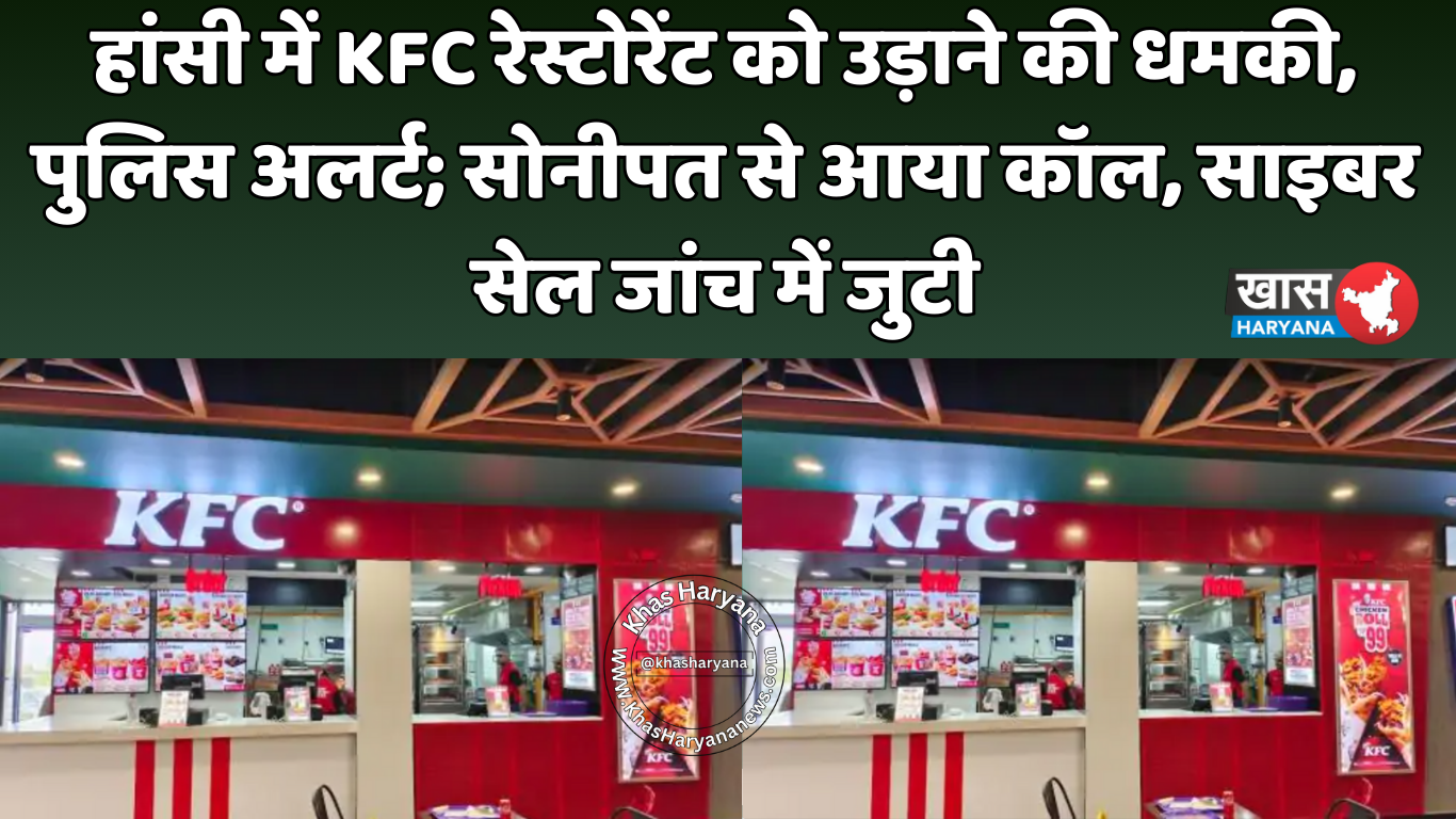 हिसार जिले के हांसी में स्थित रामायण टोल प्लाजा के पास बने KFC रेस्टोरेंट को उड़ाने की धमकी मिलने के बाद पूरे इलाके में सुरक्षा बढ़ा दी गई है। शुक्रवार सुबह पुलिस मुख्यालय में एक अज्ञात व्यक्ति ने फोन कर दावा किया कि हांसी के एक KFC रेस्टोरेंट को बम से उड़ाया जाएगा। कॉल की गंभीरता को देखते हुए हांसी पुलिस और साइबर सेल तुरंत एक्टिव हो गई।