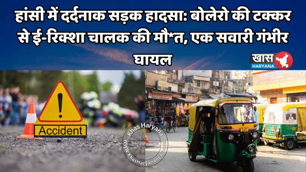 हिसार जिले के हांसी शहर में सोमवार शाम एक दर्दनाक सड़क हादसा हो गया, जिसमें ई-रिक्शा चालक की मौत हो गई और एक सवारी गंभीर रूप से घायल हो गई। हादसा 6 नवंबर की शाम करीब 7 बजे हांसी कोर्ट के पास हुआ। प्रत्यक्षदर्शियों के अनुसार, एक तेज रफ्तार बोलेरो गाड़ी ने पीछे से आकर ई-रिक्शा को जोरदार टक्कर मार दी, जिससे ई-रिक्शा हवा में उछलकर सड़क किनारे पलट गया।