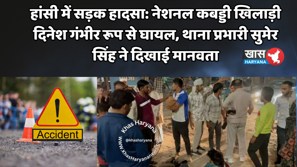 हिसार के हांसी में शनिवार रात फव्वारा चौक के पास कार और बाइक की जोरदार टक्कर में नेशनल कबड्डी खिलाड़ी दिनेश गंभीर रूप से घायल हो गया। हादसे के बाद सदर थाना प्रभारी सुमेर सिंह ने मानवता की मिसाल पेश करते हुए घायल को तुरंत अस्पताल पहुंचाया।