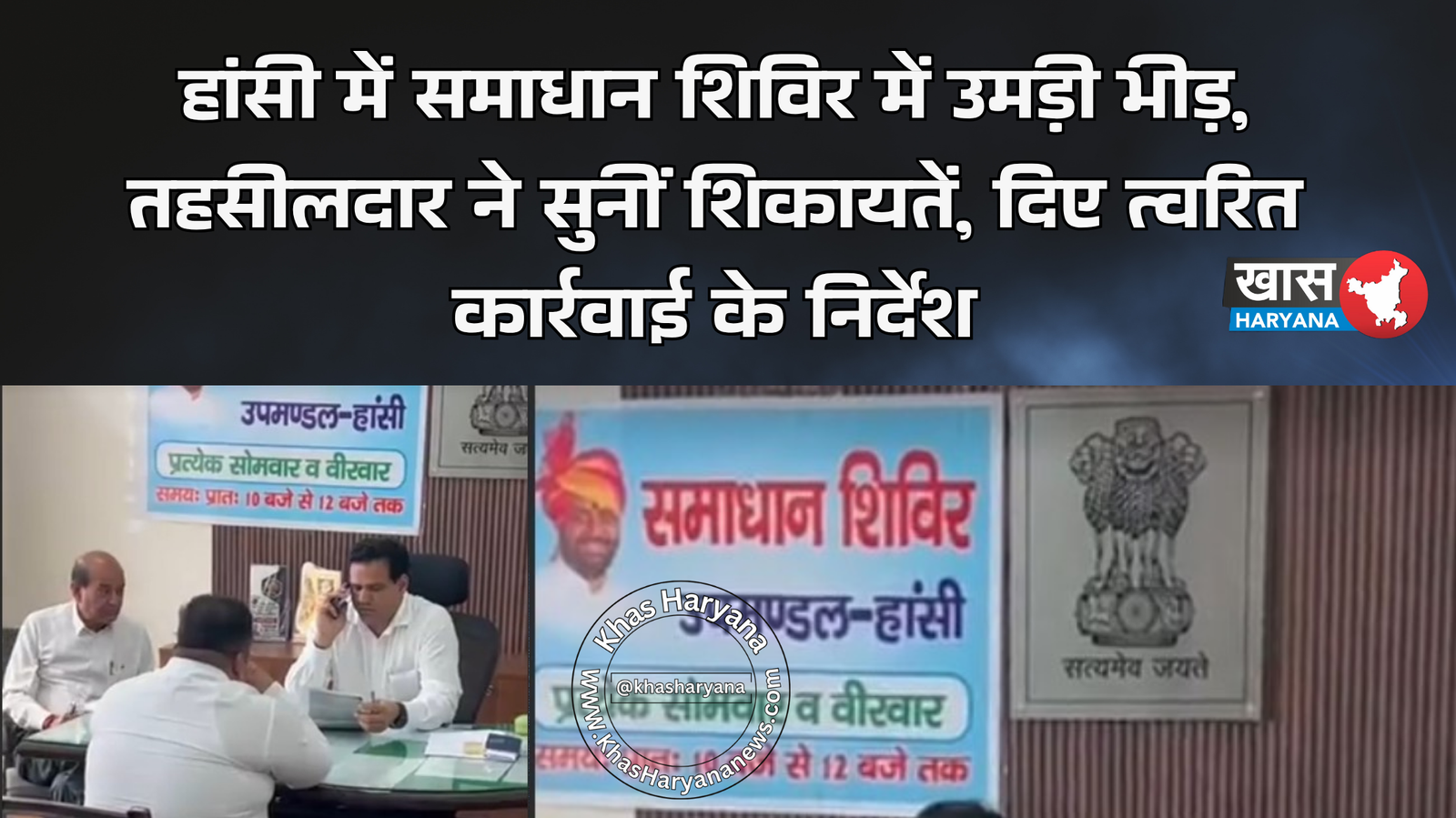 हिसार के हांसी उपमंडल परिसर में आयोजित समाधान शिविर में बड़ी संख्या में लोग अपनी शिकायतें लेकर पहुंचे। तहसीलदार अनिल कुमार बिढान ने शिकायतें सुनीं और अधिकारियों को त्वरित कार्रवाई के निर्देश दिए।