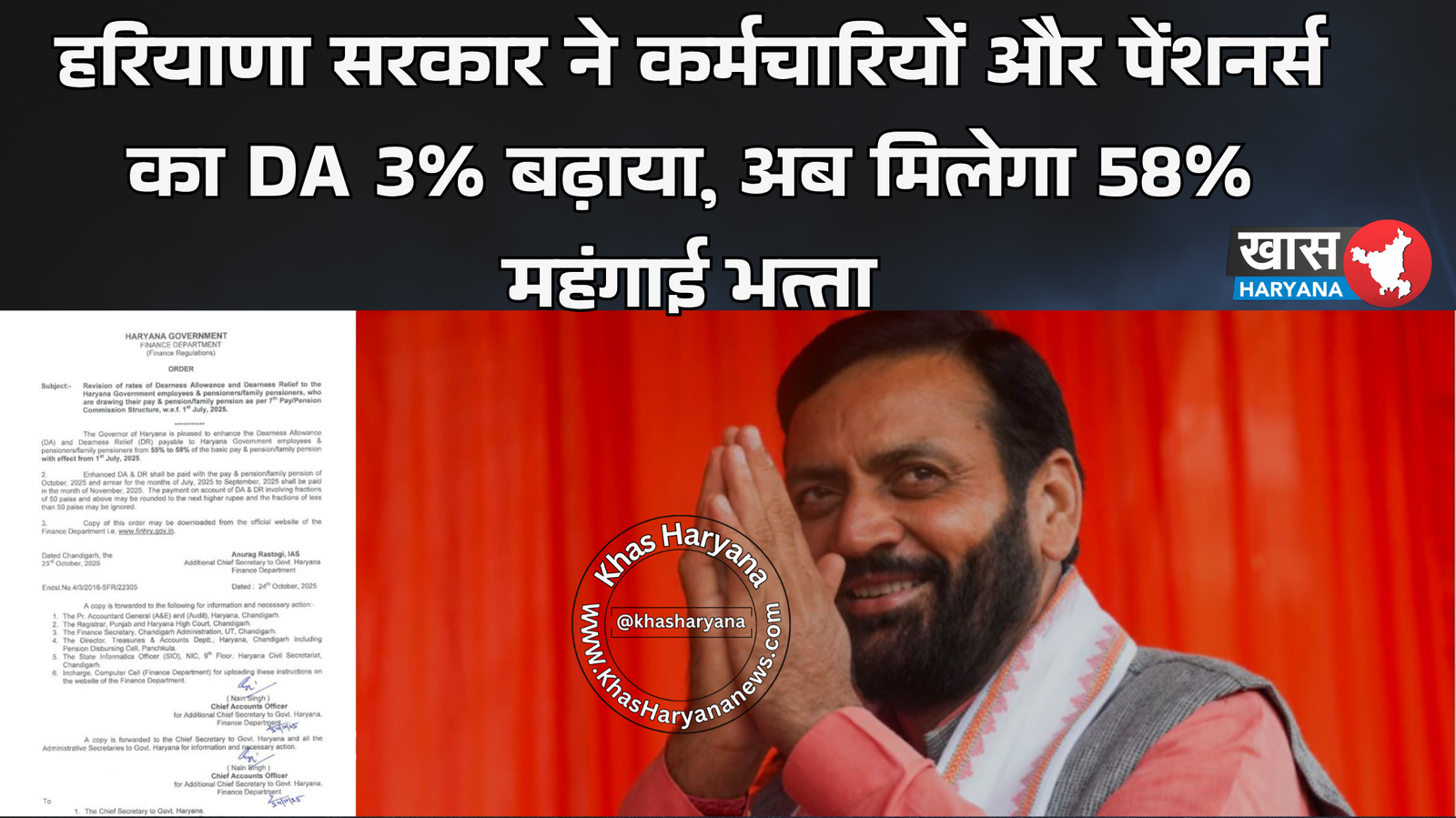 हरियाणा सरकार ने राज्य के लाखों कर्मचारियों और पेंशनर्स को दिवाली से पहले बड़ी राहत दी है। वित्त विभाग ने महंगाई भत्ता (Dearness Allowance) में 3 प्रतिशत की बढ़ोतरी की घोषणा की है। अब डीए 55% से बढ़ाकर 58% कर दिया गया है। यह बढ़ोतरी 1 जुलाई 2025 से प्रभावी होगी।
