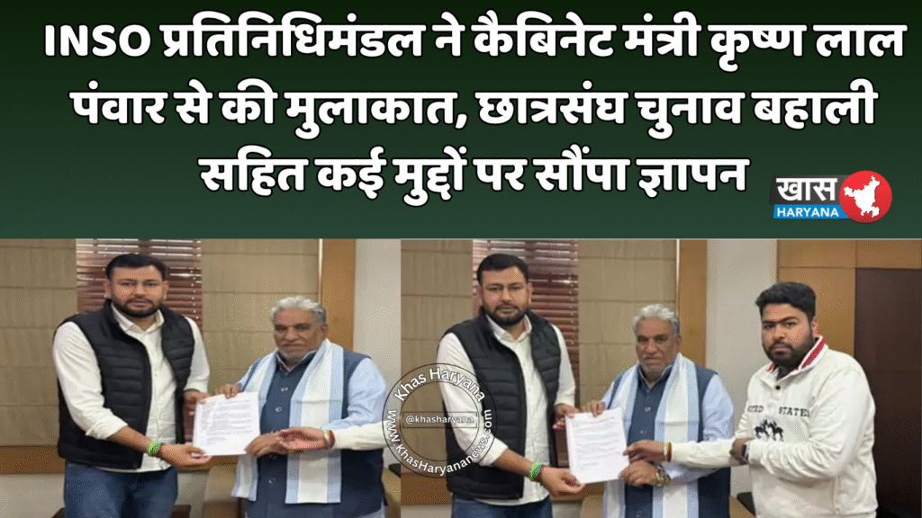 रोहतक की महर्षि दयानंद यूनिवर्सिटी (MDU) के फैकल्टी हाउस में इंडियन नेशनल स्टूडेंट्स ऑर्गेनाइजेशन (INSO) का प्रतिनिधिमंडल प्रदेशाध्यक्ष दीपक मलिक के नेतृत्व में कैबिनेट मंत्री कृष्ण लाल पंवार से मिला। इस दौरान प्रतिनिधिमंडल ने छात्रों से जुड़े कई महत्वपूर्ण मुद्दों पर चर्चा की और मंत्री को विस्तृत ज्ञापन सौंपा। मंत्री कृष्ण लाल पंवार ने भरोसा दिलाया कि छात्रों की हर समस्या को प्राथमिकता के साथ उठाया जाएगा और समाधान जल्द सुनिश्चित किया जाएगा।