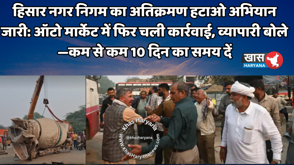 हिसार नगर निगम ने मंगलवार को एक बार फिर ऑटो मार्केट क्षेत्र में अतिक्रमण हटाओ अभियान चलाया। निगम की इस कार्रवाई का उद्देश्य शहर की सड़कों को अतिक्रमण मुक्त बनाना और यातायात व्यवस्था को सुचारु रखना है। इस दौरान निगम की टीम ने सड़क पर रखी पुरानी मशीनों, ऑटो पार्ट्स और अन्य अवरोधों को क्रेन की मदद से हटाया।