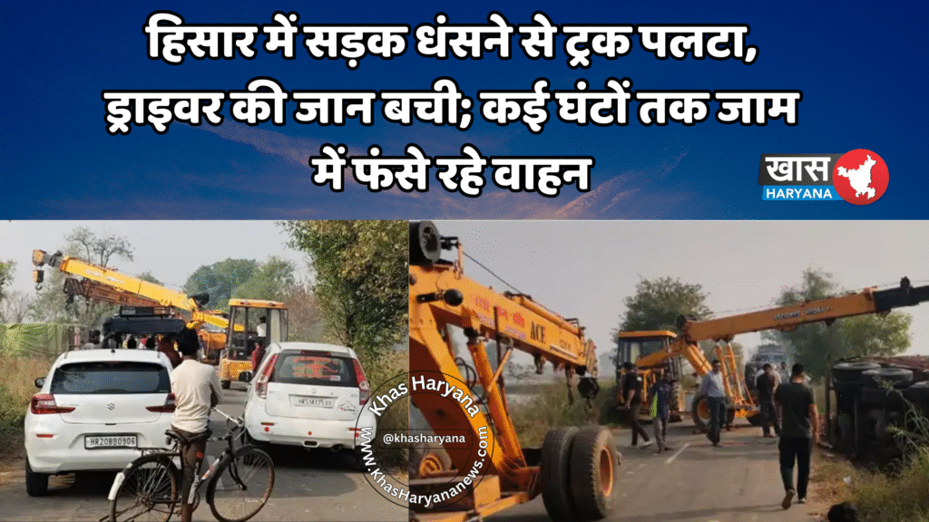 हरियाणा के हिसार जिले के बरवाला क्षेत्र में सुलखनी-धांसू रोड पर शनिवार देर रात बड़ा हादसा होते-होते टल गया। सड़क धंसने के कारण एक लोडिंग ट्रक अचानक पलट गया। हादसे में ट्रक ड्राइवर बाल-बाल बच गया, लेकिन सड़क पर घंटों तक जाम लगा रहा। ट्रक को सड़क से हटाने में रविवार सुबह तक भी भारी मशक्कत करनी पड़ी।