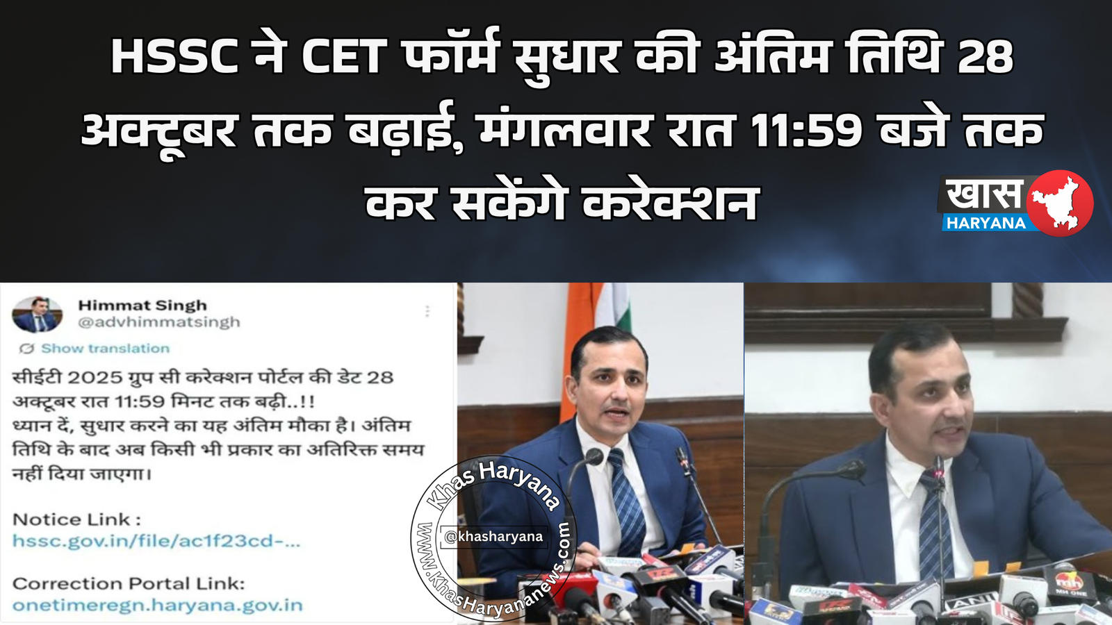 एचएसएससी के चेयरमैन हिम्मत सिंह ने सोशल मीडिया पर इसकी जानकारी साझा की। पहले करेक्शन की अंतिम तिथि 24 अक्टूबर तय की गई थी, जिसे अब 4 दिन आगे बढ़ाया गया है। आयोग ने यह निर्णय अभ्यर्थियों की सुविधा को ध्यान में रखते हुए लिया है।