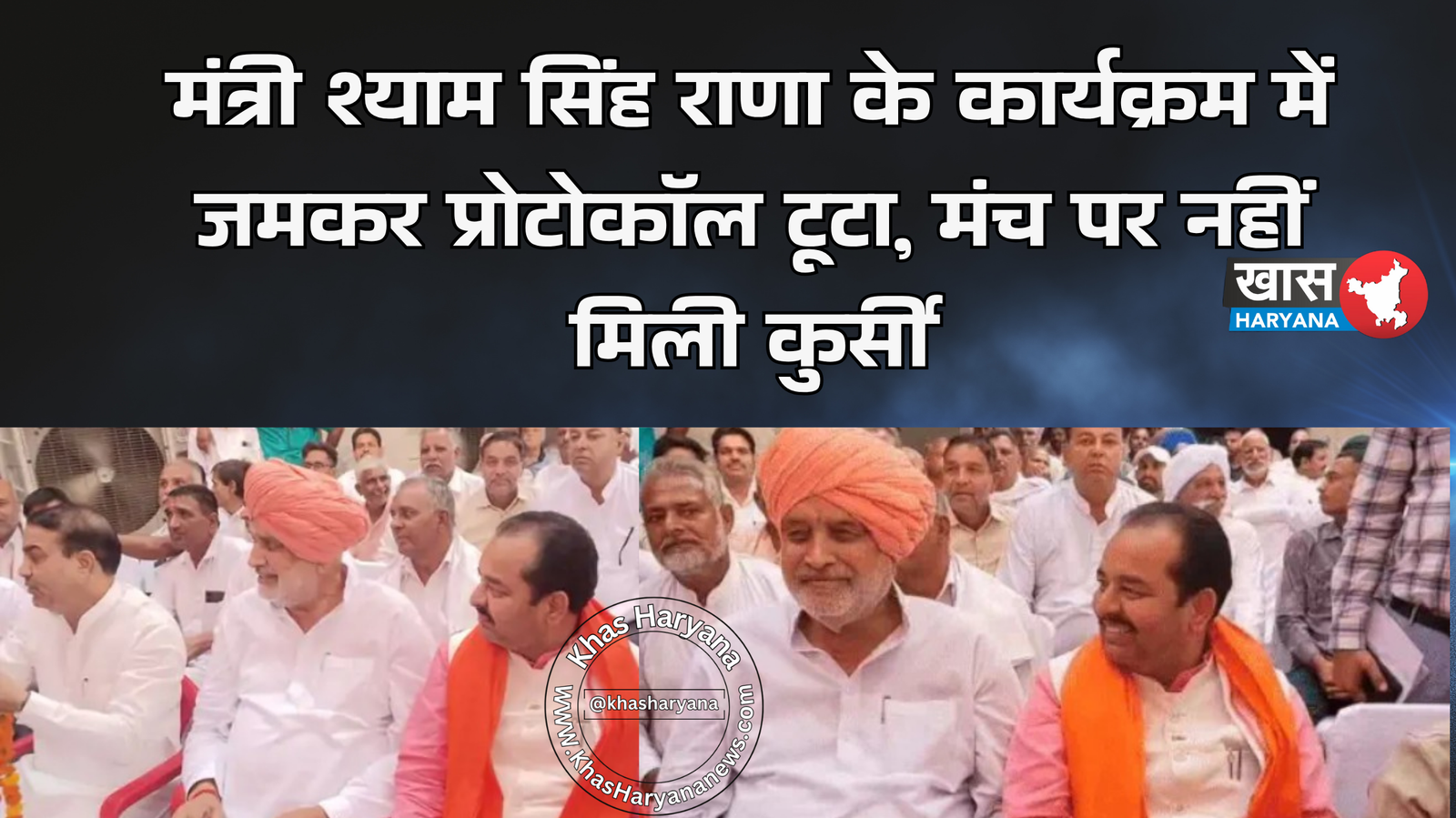 प्रदेश के कृषि एवं किसान कल्याण मंत्री श्याम सिंह राणा के कैथल जिले के चीका में आयोजित कार्यक्रम में प्रोटोकॉल टूटने का मामला सामने आया। मंत्री को मंच पर बैठने के लिए कुर्सी तक नहीं मिली।