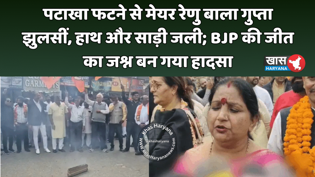 हरियाणा के करनाल में भाजपा की मेयर रेणु बाला गुप्ता बिहार में भाजपा की बड़ी जीत का जश्न मनाते समय पटाखा फटने से झुलस गईं। यह हादसा उस समय हुआ जब मेयर पार्टी कार्यकर्ताओं के साथ करनाल में जश्न के बीच मीडिया से बातचीत कर रही थीं। अचानक फटा पटाखा उनके हाथ और पेट पर आकर लगा, जिससे उनकी साड़ी का कुछ हिस्सा भी जल गया और मौके पर अफरा-तफरी मच गई।