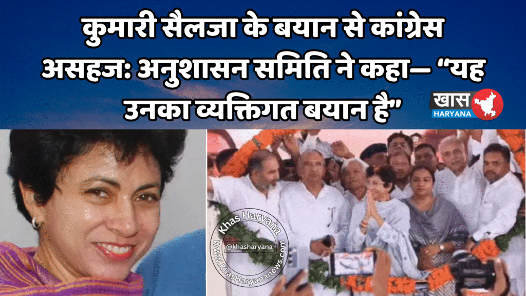 हरियाणा में कांग्रेस की सीनियर नेता और सिरसा से सांसद कुमारी सैलजा के पूर्व मंत्री संपत सिंह को लेकर दिए गए बयान से कांग्रेस में हलचल मच गई है। पार्टी अब उनके बयान से असहज नजर आ रही है। मामला इतना बढ़ गया कि कांग्रेस की अनुशासन समिति तक पहुंच गया। हालांकि समिति ने सैलजा के बयान से पूरी तरह किनारा करते हुए इसे उनका व्यक्तिगत बयान बताया है।