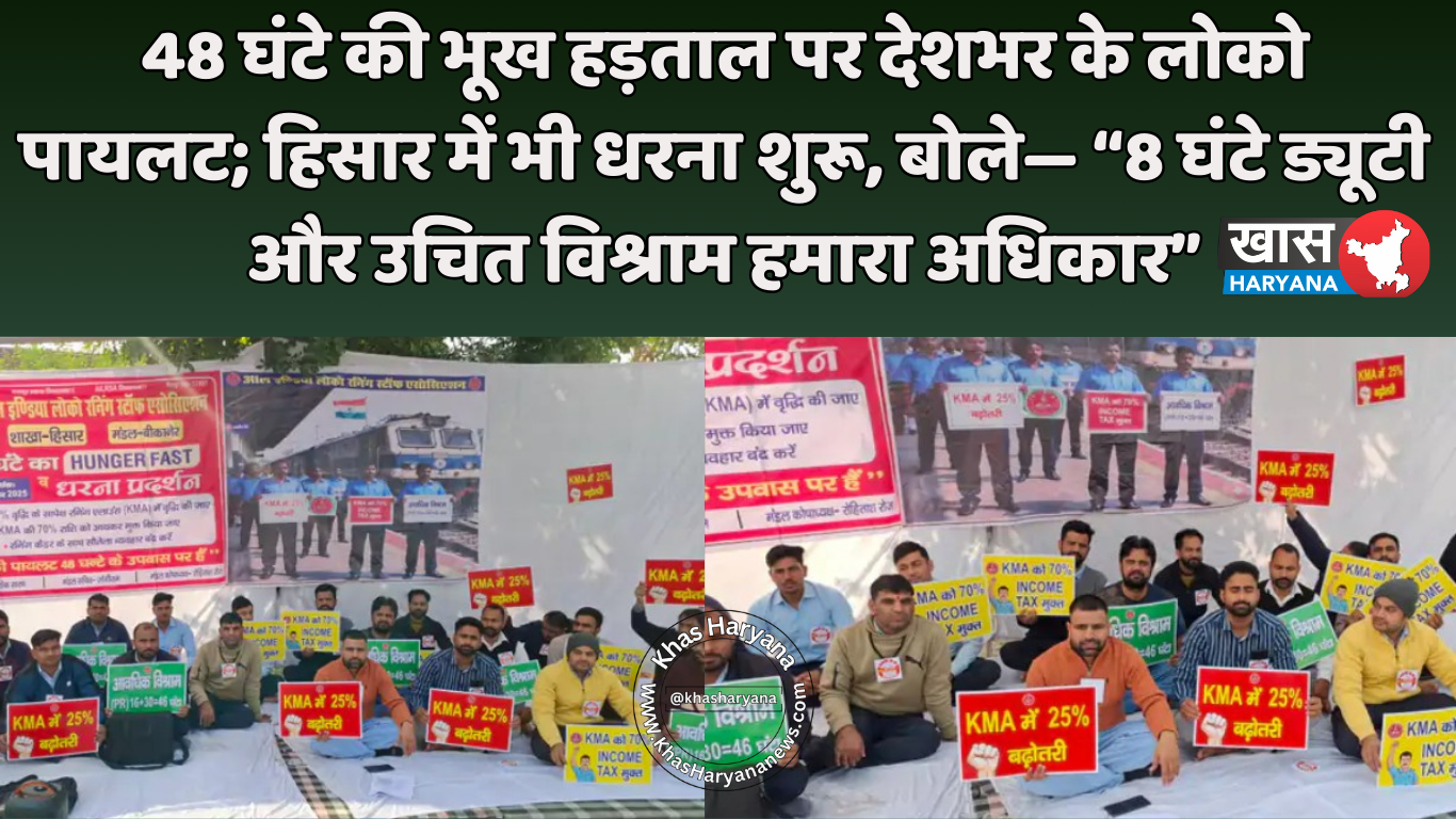 देशभर के लोको पायलट 48 घंटे की भूख हड़ताल पर, हिसार स्टेशन पर भी प्रदर्शन— 8 घंटे ड्यूटी और सही विश्राम की मांग तेज