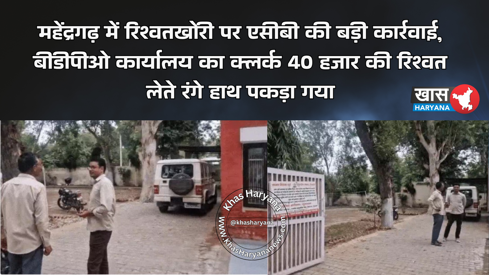 महेंद्रगढ़ जिले के अटेली बीडीपीओ कार्यालय में एसीबी ने छापा मारकर क्लर्क पवन कुमार और उसके सहयोगी ईश्वर सिंह को 40 हजार रुपए की रिश्वत लेते रंगे हाथ पकड़ा। शिकायतकर्ता हरिराम की शिकायत पर यह कार्रवाई की गई।