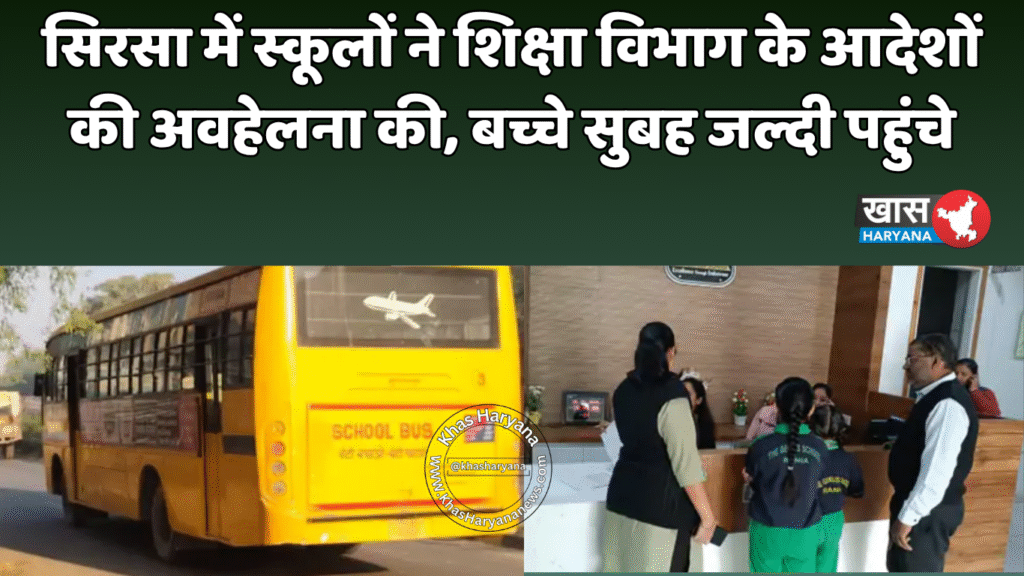 सिरसा जिले में प्राइवेट और सरकारी स्कूलों ने शिक्षा विभाग के समय बदलाव के आदेशों की अवहेलना की। शनिवार को जिले के कई स्कूलों में बच्चे सुबह 8:00 बजे से पहले स्कूल पहुंचे। कुछ बच्चों को यह भी पता नहीं था कि स्कूल का समय बदल गया है, जबकि कुछ को टीचरों ने समय बदलाव की जानकारी नहीं दी।